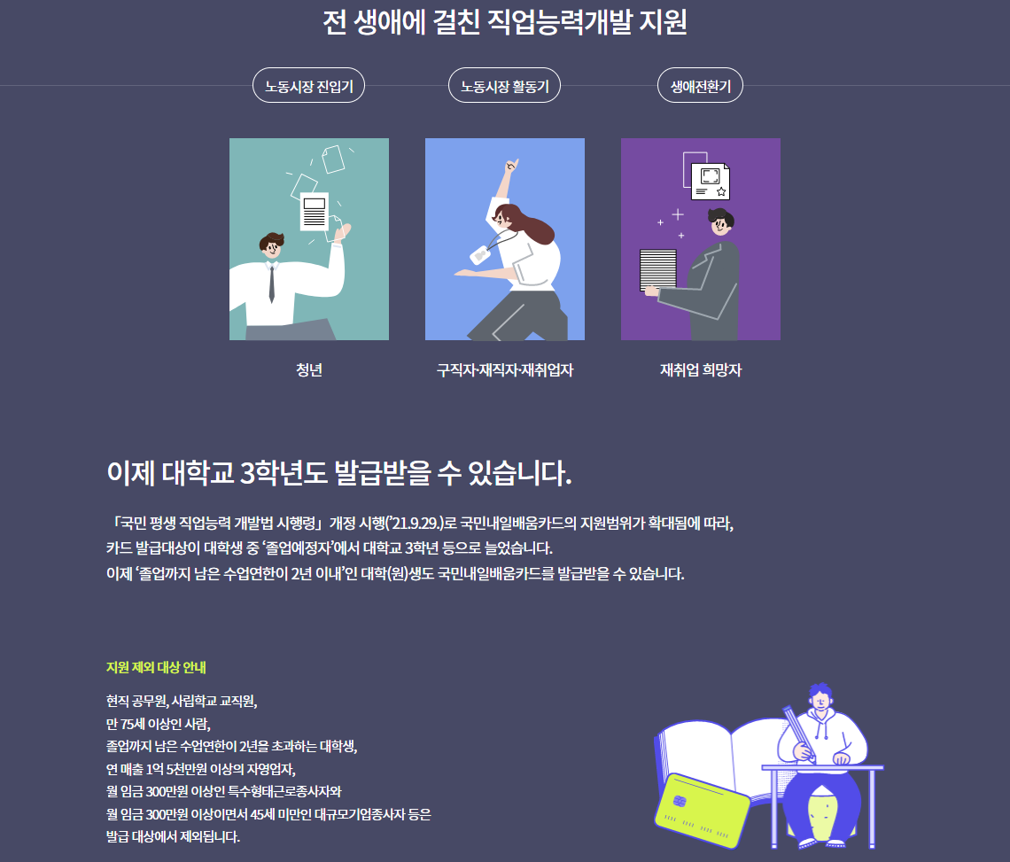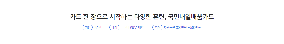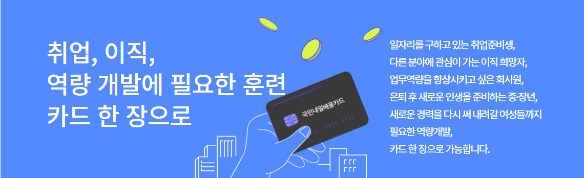 생애에 걸쳐 직무수행능력 습득·향상을 위해 정부에서는 국민 스스로가 직업능력개발훈련을 실시할 수 있도록 300~500만원의 훈련비 등을 지원하는 국민내일배움카드에 대해서 알아보도록 하겠습니다.