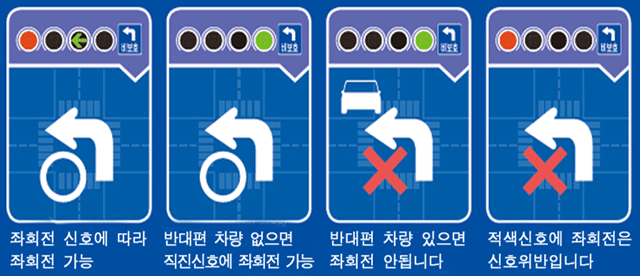 쉽게 말해 두 번의 좌회전 기회가 주어지는 것으로, 고민 없이 초록불이라면 모두 좌회전이 가능하다고 기억해주시면 되겠습니다. 직진신호 일 경우 반대편 차량이 없는지 확인후에 좌회전 하시면 됩니다. 적색 신호일때 좌회전은 신호 위반입니다.