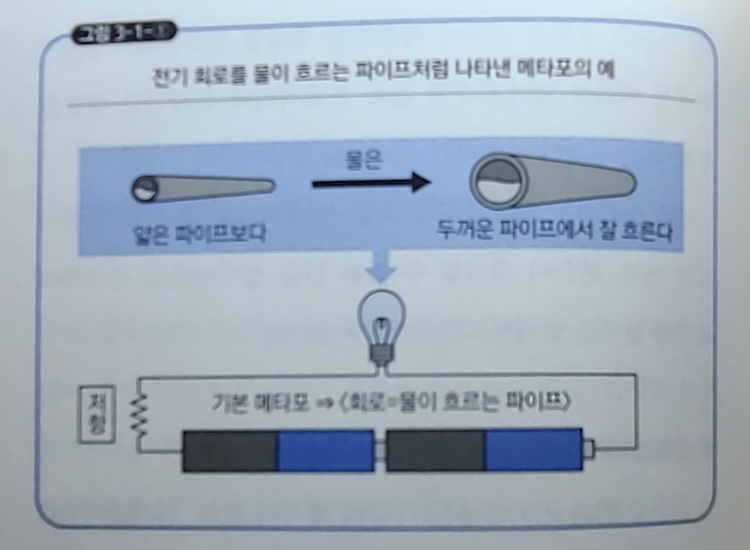 메타포가 가진 효과는 언어의 영역만이 아니다. 학교에서 전기 회로를 배울 때, 회로를 물이 흐르는 파이프 등으로 비유하여 생각하는 경우가 많다. 그림 3-1-①과 같이 <물이 흐르는 파이프>를 기본 메타포로 한다면, 저항과 전압이라고 하는 추상적인 원리를 쉽게 상상할 수 있다. 공식을 적용하는 것만으로는 정답은 맞출 수 있지만, 의미를 이해할 수 없어 납득이 되지 않는 경우가 많을 것이다. 공식과 매뉴얼에 대입한 지식은 '절차적 지식'이라고 부르는데, 이것으로는 무언가를 깨닫게 되는 납득감을 얻을 수 없다.