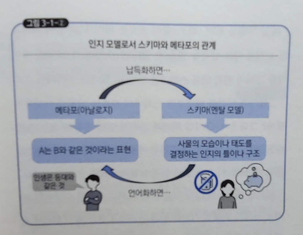 앞서 나온 문장에서처럼 메타포는 서로 다른 것을 대비시키는 형태의 언어 표현인데, 이것이 어떻게 이해를 깊게 만들어줄까? 그 원리를 알기 위해 필요한 것은 인식의 틀이라고도 할 수 있는 '스키마(schema)'이다.