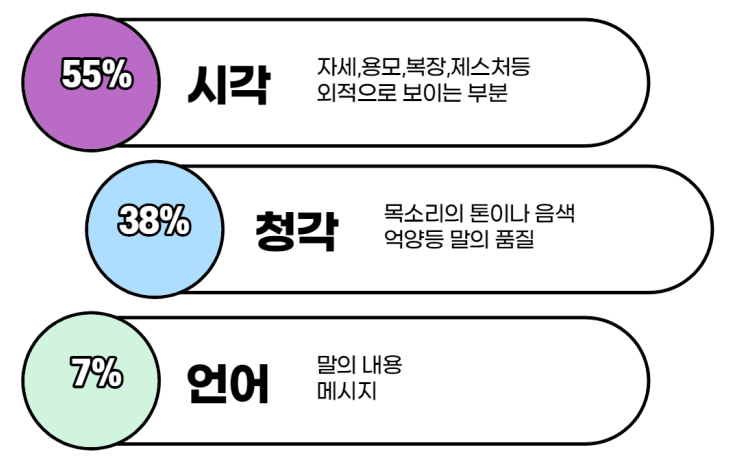 사람의 태도와 심리를 파악하려고 할 때, 자기계발서등에서 자주 사용되는 것이 '메라비언의 법칙(mehrabian's rule)이다(그림 2-3 참조). 이 법칙은 상대방에 대한 인상이나 호감을 결정하는 데 있어서 말의 내용보다 몸짓과 표정으로 판단하게 된다는 이론이지만, 사실 캘리포니아 대학의 A. 메라비언은 자신의 연구가 말하고자 했던 것은 그것이 아니라고 했다. 그는 실험에서 무뚝뚝하게 대하면서 상대방을 칭찬하는 등 말과 행동이 일치되지 않는 상황을 설정하고, 사람이 무엇을 우선하여 상대의 감정과 태도를 판단하는지를 조사했다. 이것을 오해하여 '사람은 겉으로 보이는 게 중요하다'고 하는 보편적인 법칙처럼 일면적인 해석을 해버린 것이다.