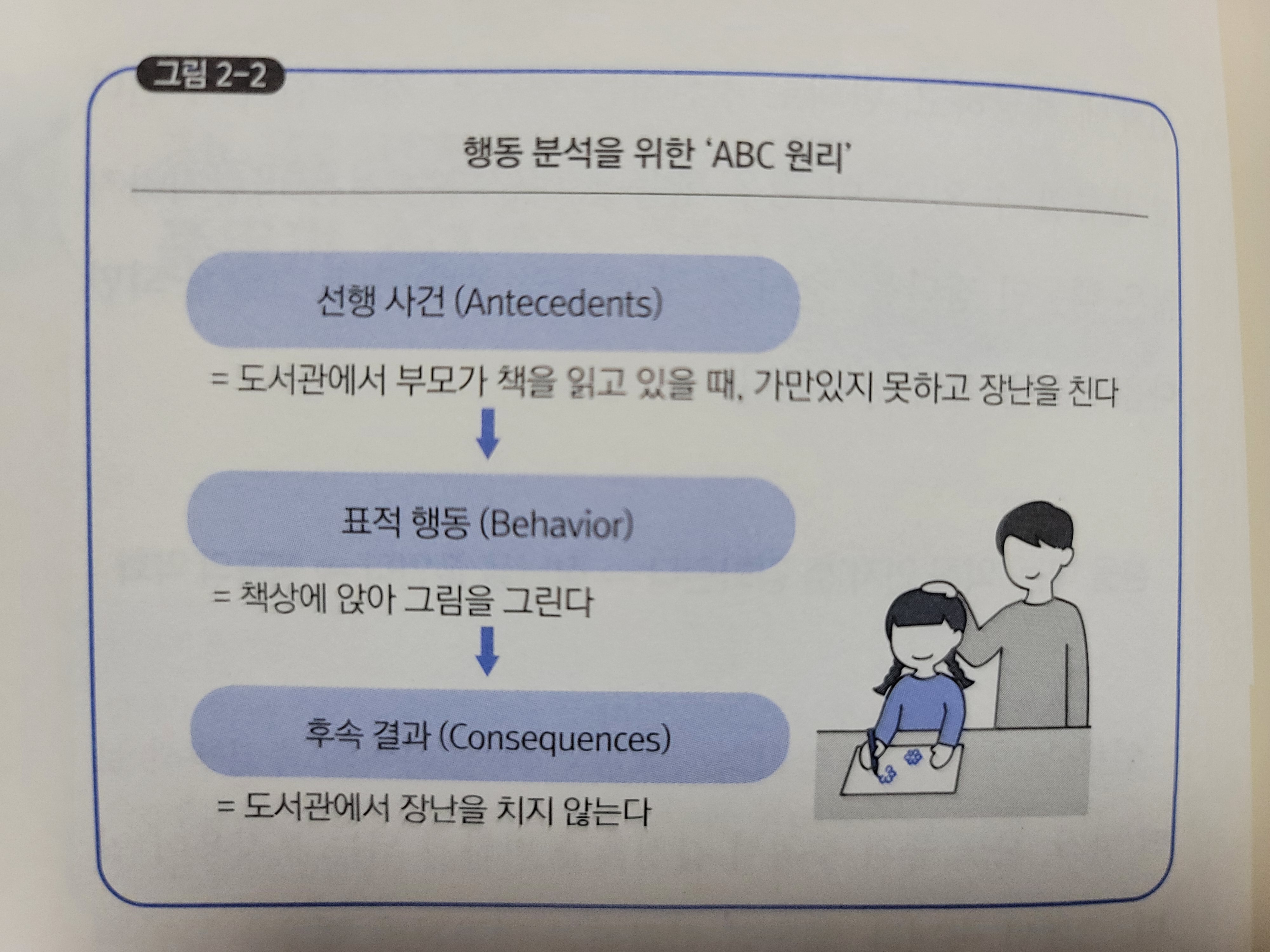 여기서 정리를 위해, 행동분석학의 'ABC 원리'라고 하는 방식을 적용하여 '장난을 줄이는 데까지의 단계를 식으로 나타내 보면, 그림 2-2처럼 나타나게 된다. 즉, 여기서 칭찬의 대상은 '그림 그리기'이고, 이것을 강화하면 장난을 하지 않게 된다는 것이다.
