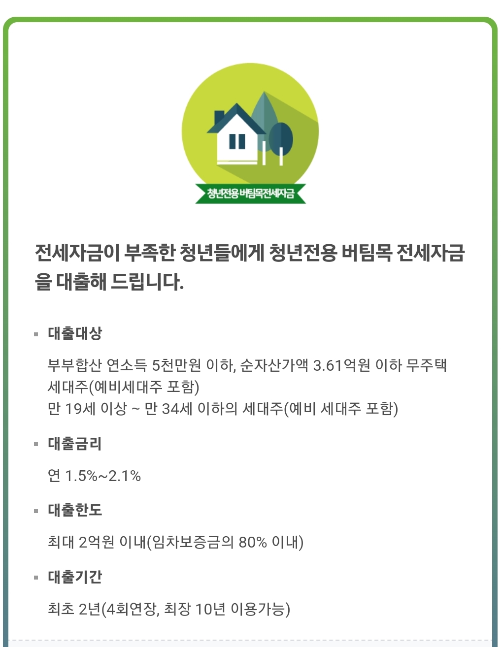 청년 전용 버팀목 전세자금 상품에 대해 간략히 알아보았습니다.