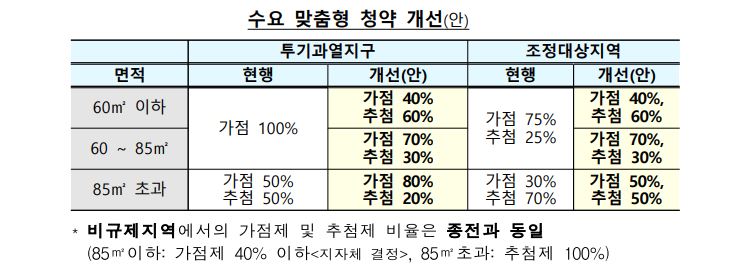 - 전용 60㎡ 이하에서는 신혼부부나 청년층에 수요가 많은 평수에 해당되어 가점 100% → 가점 40%, 추첨 60%로 개선이 되었습니다.