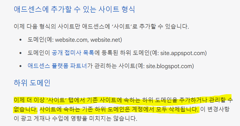 그래서 하나의 메인 도메인을 애드센스로 승인 받으면 거기에 딸린 하위도메인도 애드센스 광고를 올릴수 있었습니다. 그런데 사이트에 속하는 기존 하위 도메인은 계정에서 모두 삭제됩니다? 하위도메인에 이제는 광고를 못올리게 되는 건가 하는 의미로 들리네요.