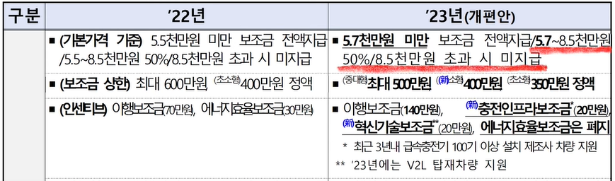 작년까지 승용차 기준 100% 지급은 차량 가격이 5500만 원 미만인 경우에만 해당되습니다. 그러나 새개편안에 따르면 5700만원 미만의 전기차로 약 200만 원 가량 상향 조정되는데요. 최근 원자재 가격격등에 따른 배터리 가격 인상되 이유로 보조금 전액 지급 기준을 200만 원 인상한 것으로 볼 수 있습니다.